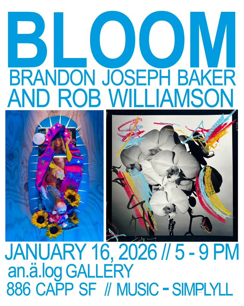 The show brings together two professional photographers with active art practices — Brandon Joseph Baker and Rob Williamson — who have created new work specifically for BLOOM.